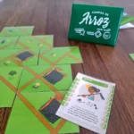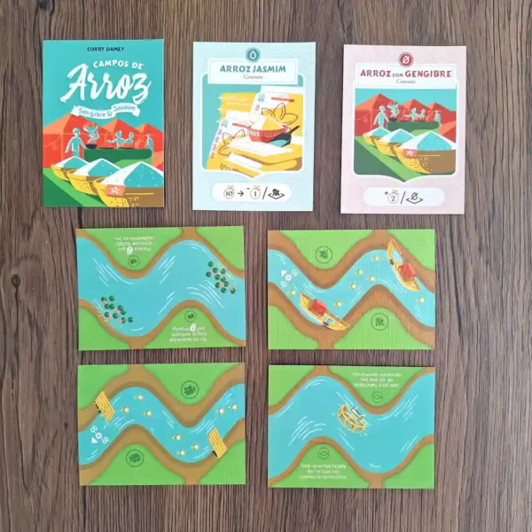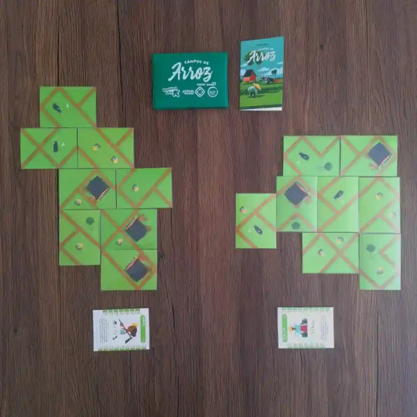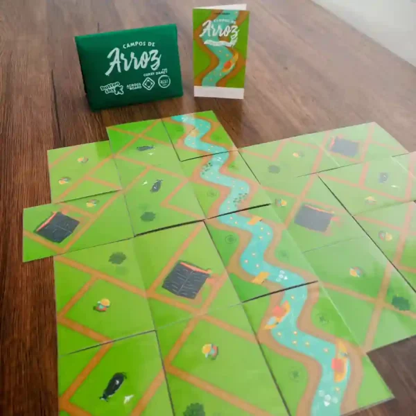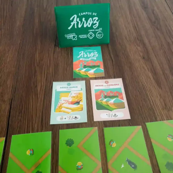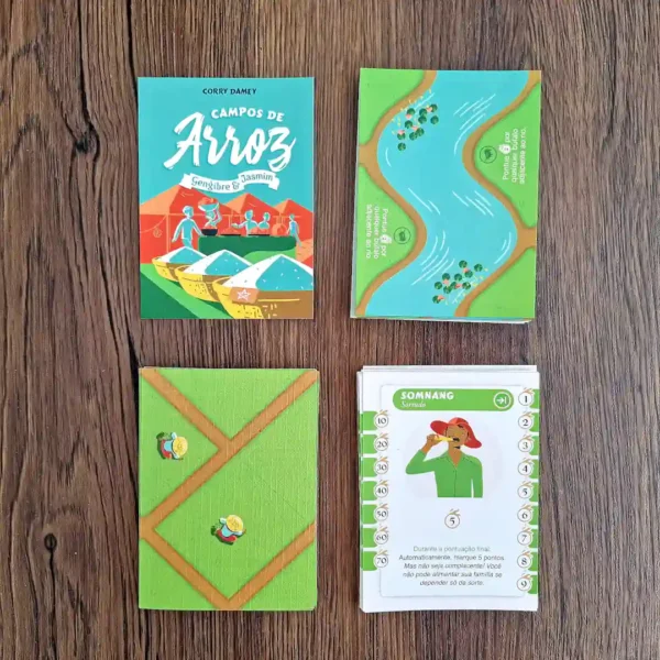 Em Campos de Arroz, cada jogador assume o papel de agricultor, cultivando cartas de arroz para expandir os arrozais de sua família e conquistar as colheitas mais abundantes.