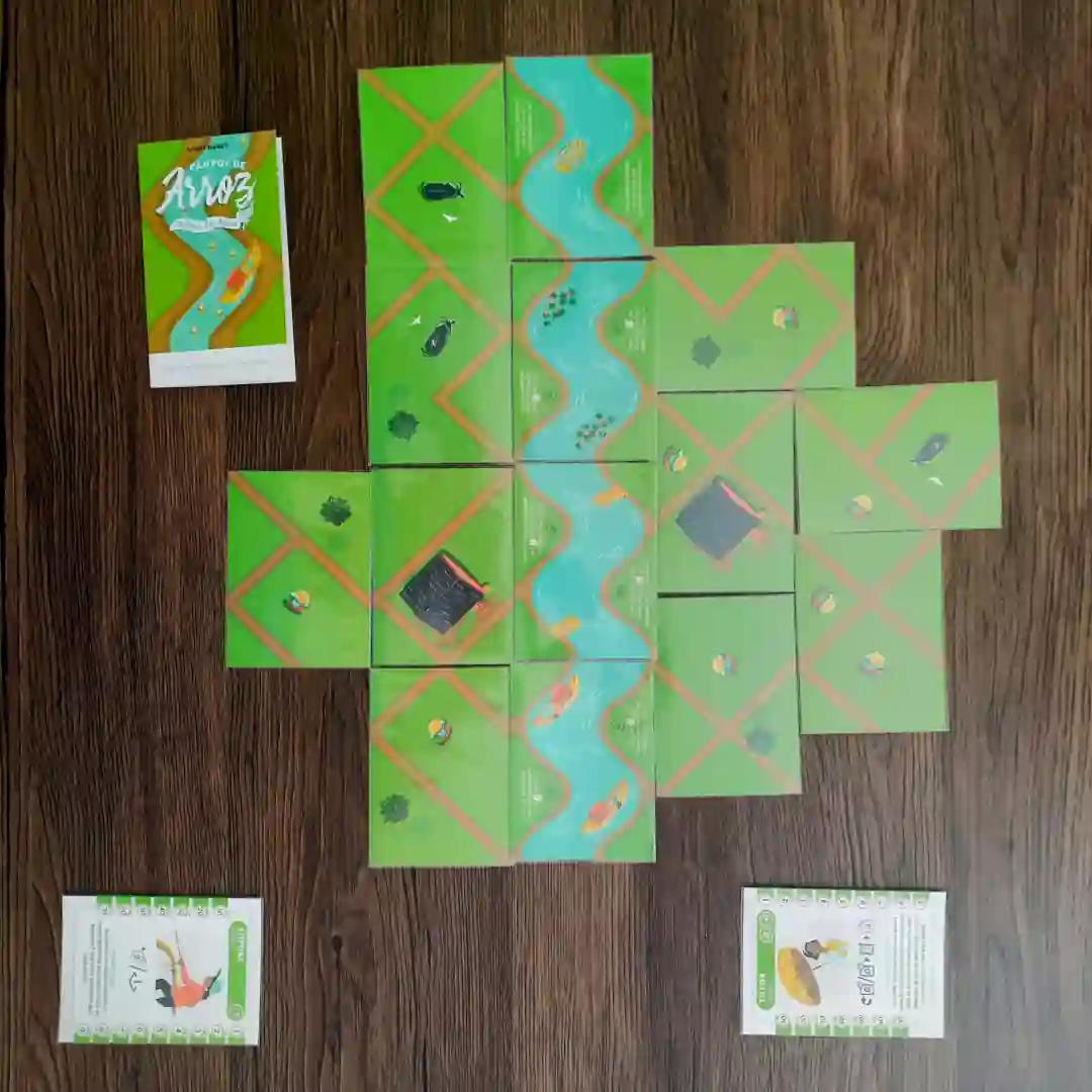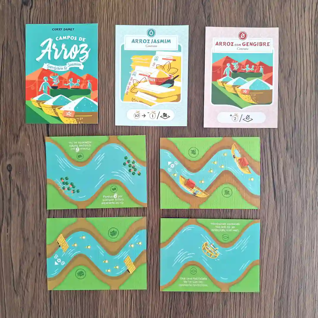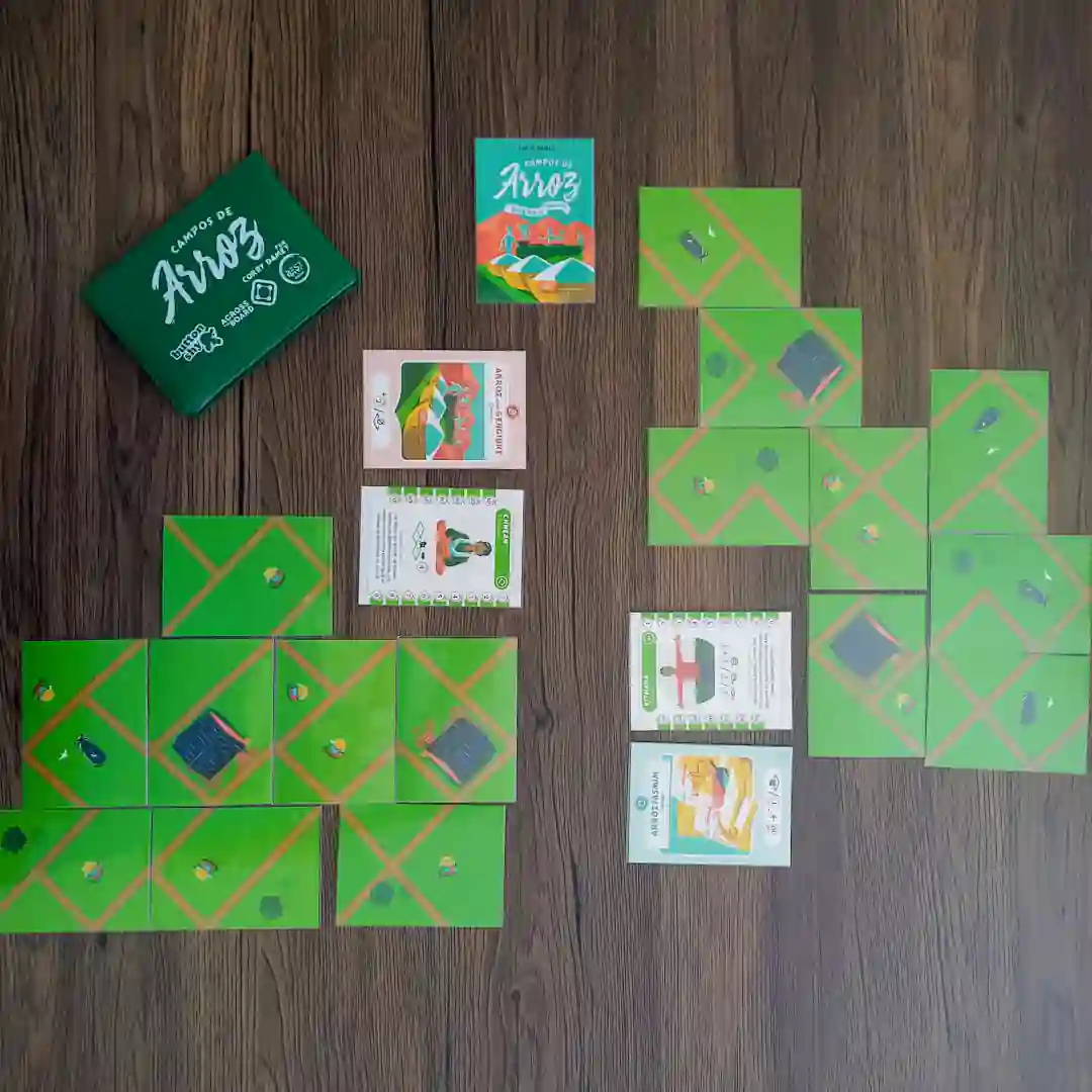 Em Campos de Arroz, cada jogador assume o papel de agricultor, cultivando cartas de arroz para expandir os arrozais de sua família e conquistar as colheitas mais abundantes.