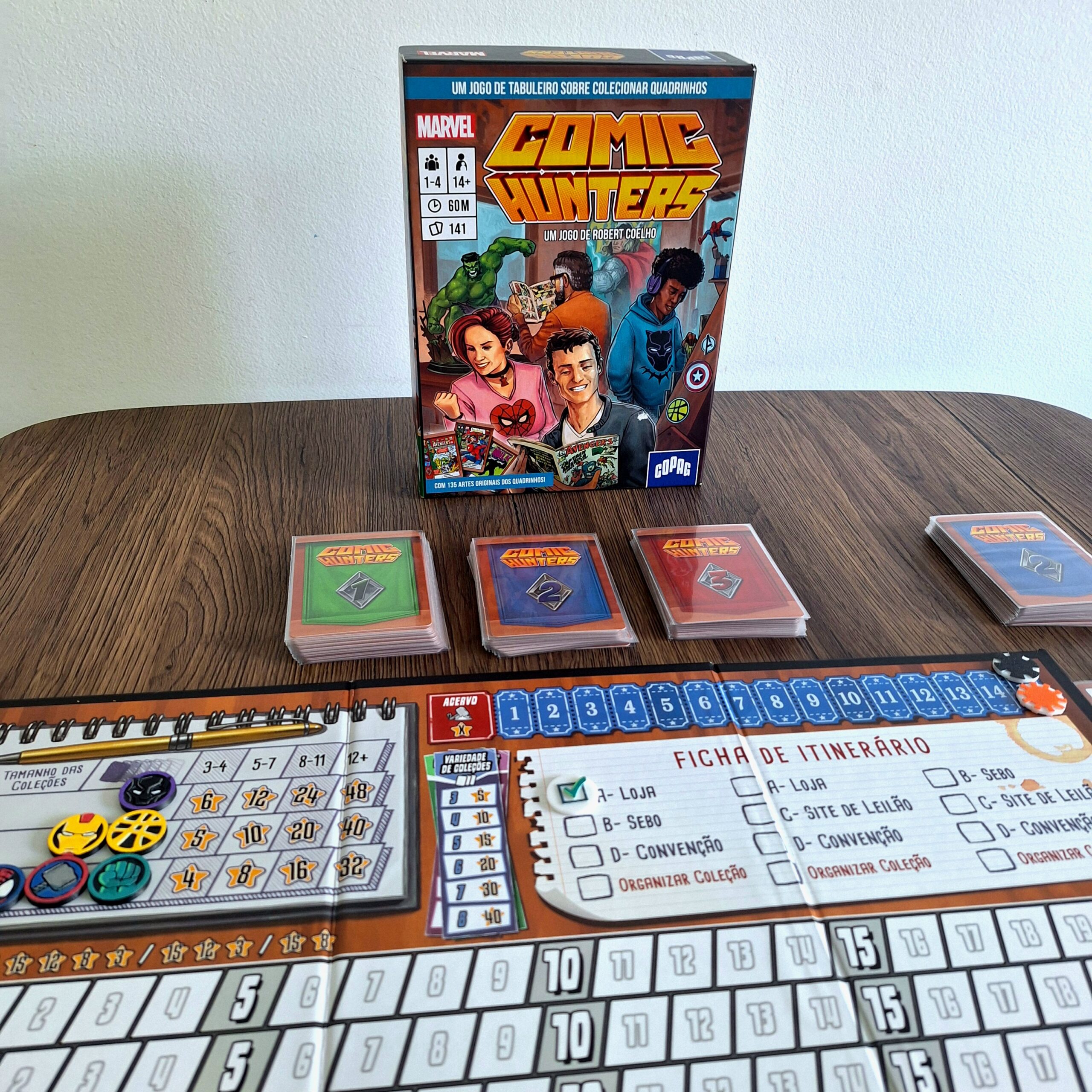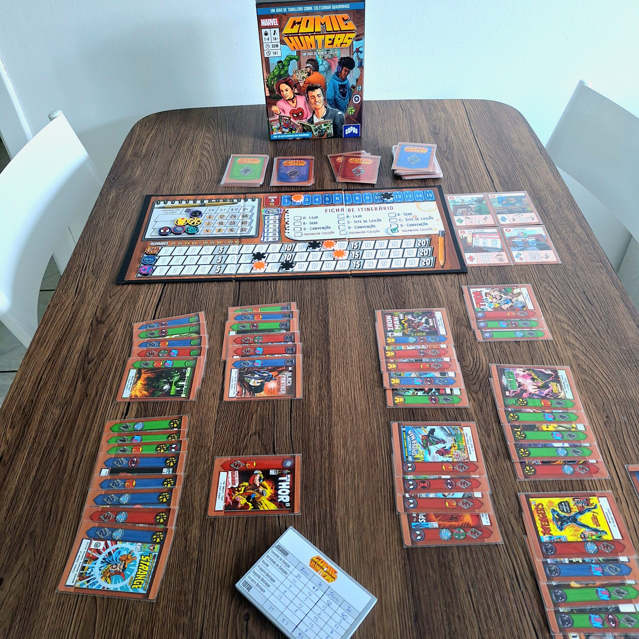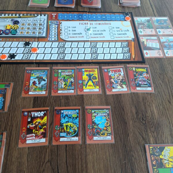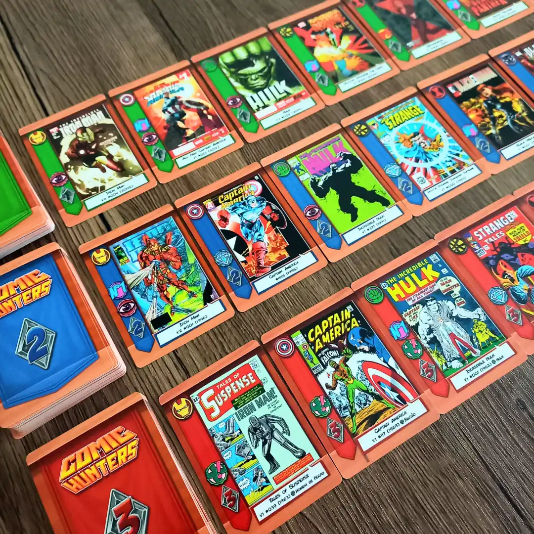Comic Hunters é um jogo em que os jogadores disputam as HQs mais valiosas da Marvel, montando coleções por tamanho, variedade de heróis e Destaques. Após três rodadas, quem somar mais pontos vence.