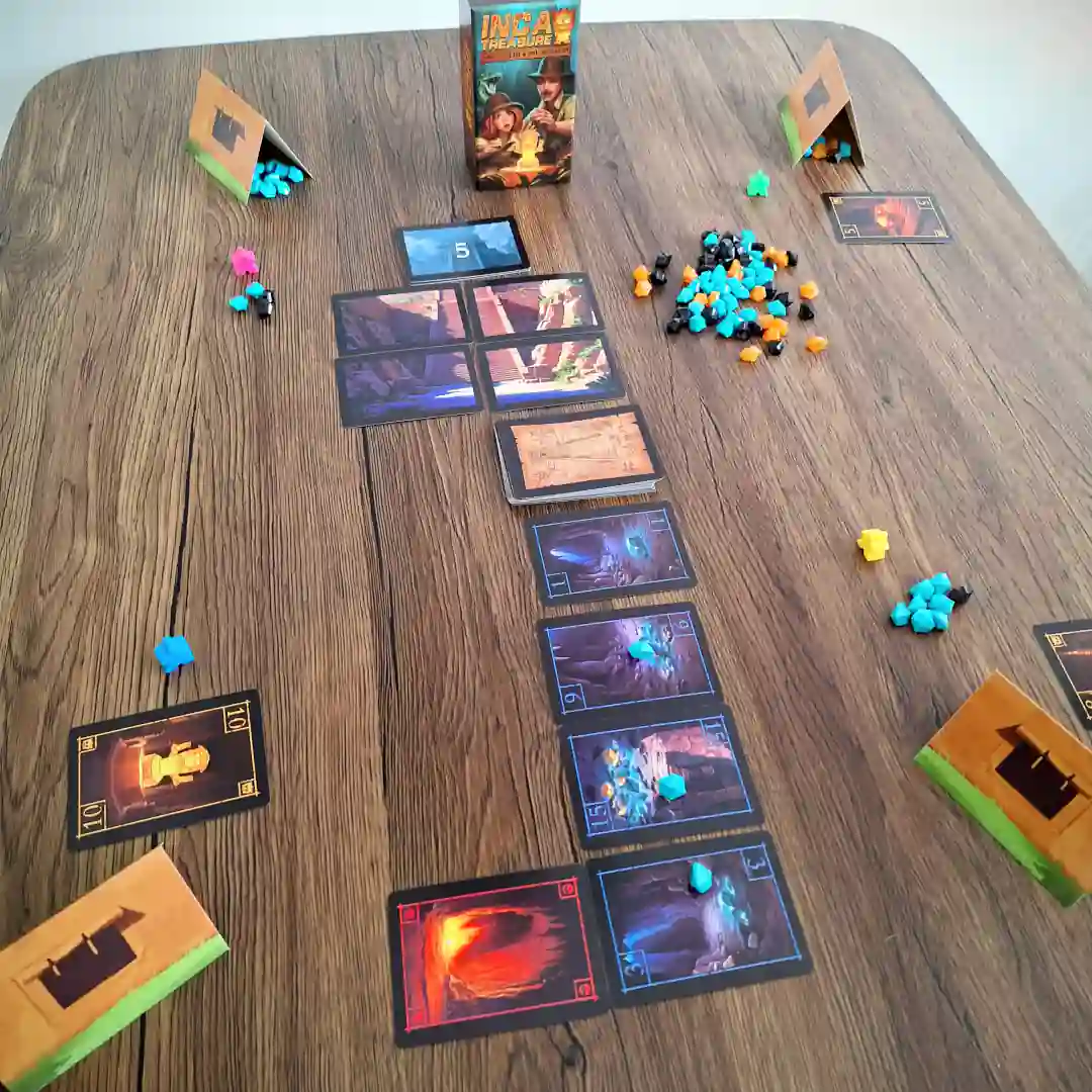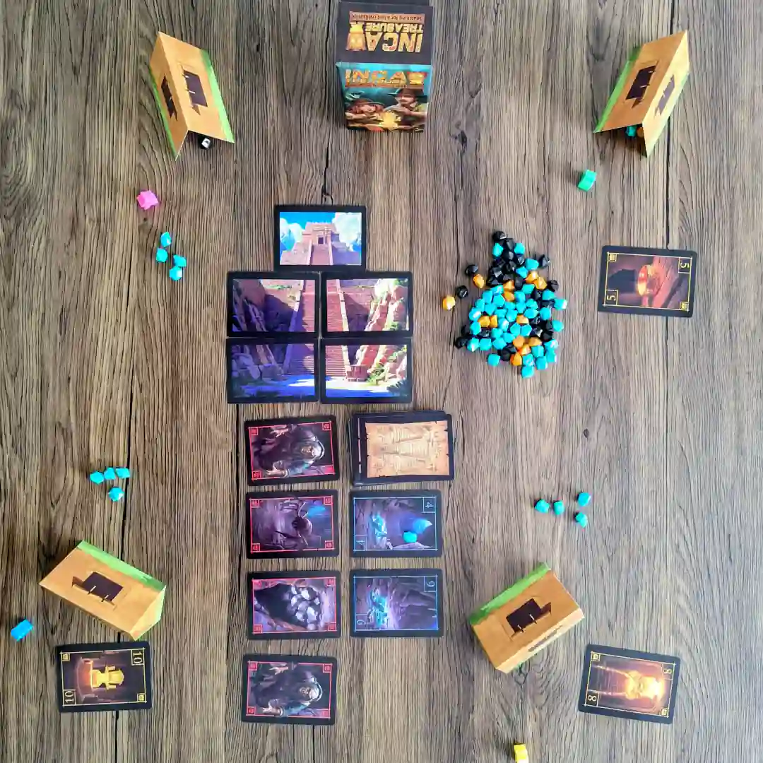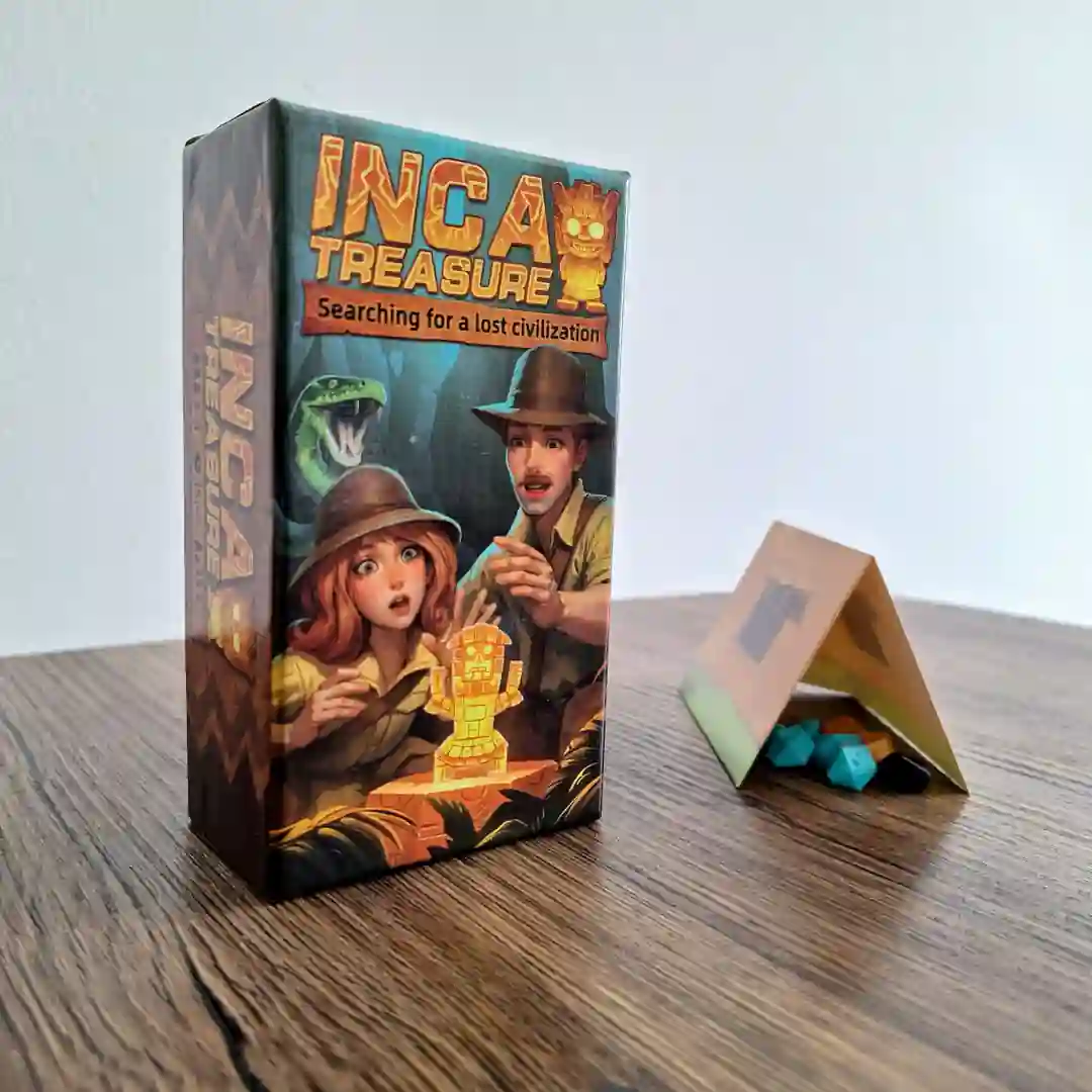 Inca Treasure – Tesouro Inca é um jogo rápido, divertido e tenso em que você e outros aventureiros partem em expedição para explorar um antigo templo inca em busca de ouro e tesouros. Em cada uma das cinco rodadas, você secretamente escolhe se você quer continuar a explorar o templo em busca de mais tesouro ou recuar para a segurança de seu acampamento com sua parte do que foi descoberto até agora.