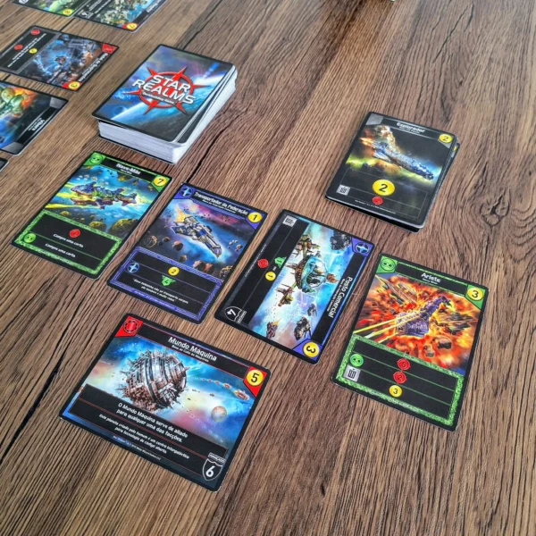O conflito se expande para as fronteiras do espaço! Em Star Realms, você constrói sua frota galáctica em tempo real. Compre naves poderosas e estabeleça bases de defesa para reduzir a autoridade do seu oponente a zero. É um jogo de construção de baralho dinâmico e viciante, onde o poder de fogo aumenta a cada turno, exigindo adaptação constante.