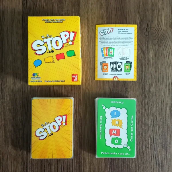 Um dos maiores clássicos brasileiros está de volta com uma nova roupagem. Com regras fáceis e quatro modos de jogo, você escolhe o desafio ideal. É perfeito para se divertir com os amigos ou com a família, usando apenas o raciocínio rápido. Como no original, UeStop! garante partidas rápidas, cheias de risadas e testes para os seus reflexos mentais.